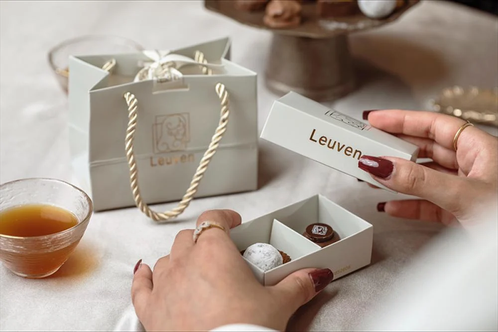 توزيعه كيس مع بوكس تحتوي على قطعتين من الشوكلاتة السويسرية الفاخرة